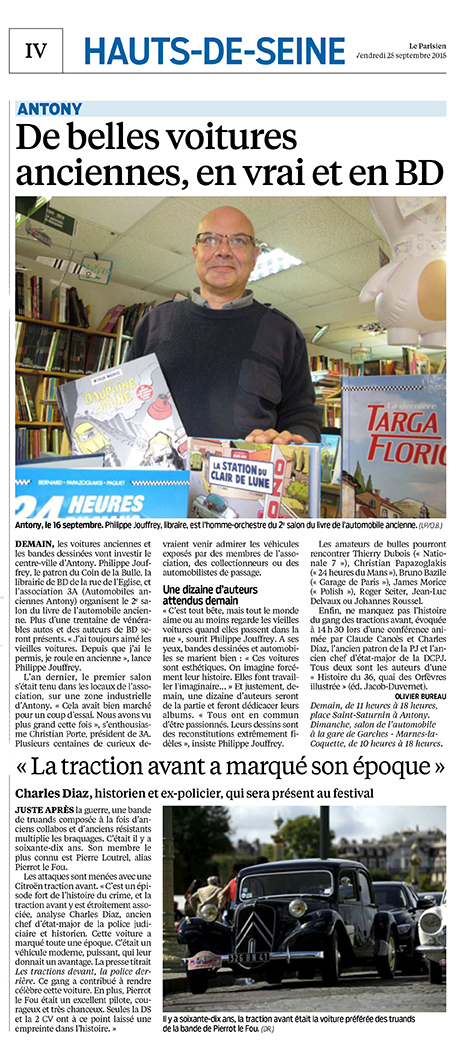Exposition statique de voitures historiques de collection et/ou de compétition, dédicaces de BD par leurs auteurs (Phil Castaza pour «La Ds», Arnaud Poitevin pour «Le Marin, l’Actrice et la Croisière jaune», Denis Bernard pour «Alpine, le sang bleu» et sa trilogie consacrée à Colin Chapman, François-Marie Dumas pour «Motos Nougier 1932 – 1972»), conférence-dédicace avec Claude Cancès, ancien directeur de la Police judiciaire parisienne, et Charles Diaz, ancien chef d’état-major de la direction centrale de la police judiciaire, autour de «Histoire du 36, Quai des Orfèvres illustrée» et de «La nouvelle épopée des Brigades du Tigre», vente de livres spécialisés, animations diverses avec notamment Les Triplettes de Bonneville…. samedi 20 septembre, de 11 h à 17 h, le 1er Salon du livre dédié à l’automobile ancienne d’Antony et son rassemblement de voitures de collection organisés dans le cadre des Journées européennes du Patrimoine par les associations 3A (Automobiles Anciennes Antony) et AAHTP (Amicale Automobiles Historiques des Travaux Publics), en partenariat avec Le Coin de la Bulle (boutique spécialisée d’Antony), ont connu un vrai succès. Retour en images sur une belle réussite …